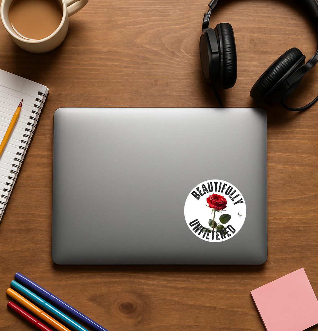 This round vinyl sticker features a bold red rose and the words “Beautifully Unfiltered”—a reminder that authenticity is its own kind of beauty. Printed on durable, high-opacity vinyl, it’s perfect for laptops, water bottles, notebooks, or anywhere you want to leave a little power behind.