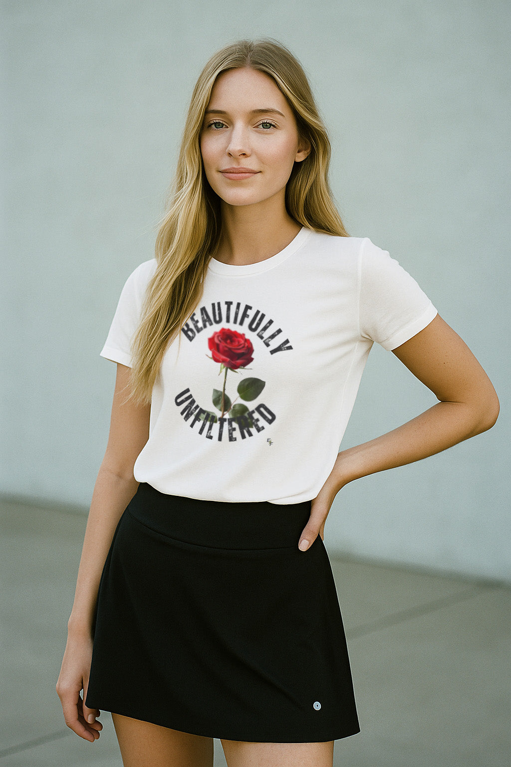 At its center: a striking red rose and the words “Beautifully Unfiltered”—a reminder that raw, real, and radiant always wins.