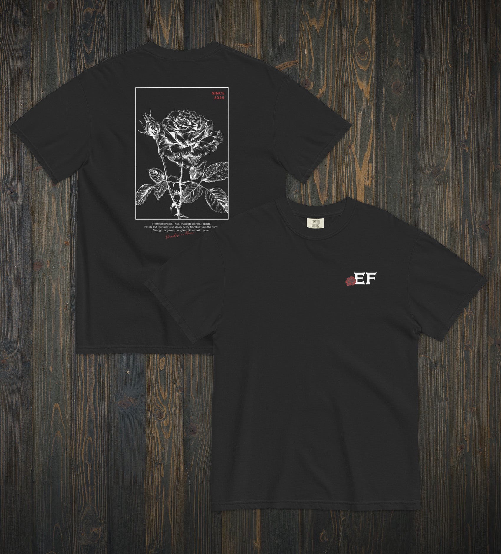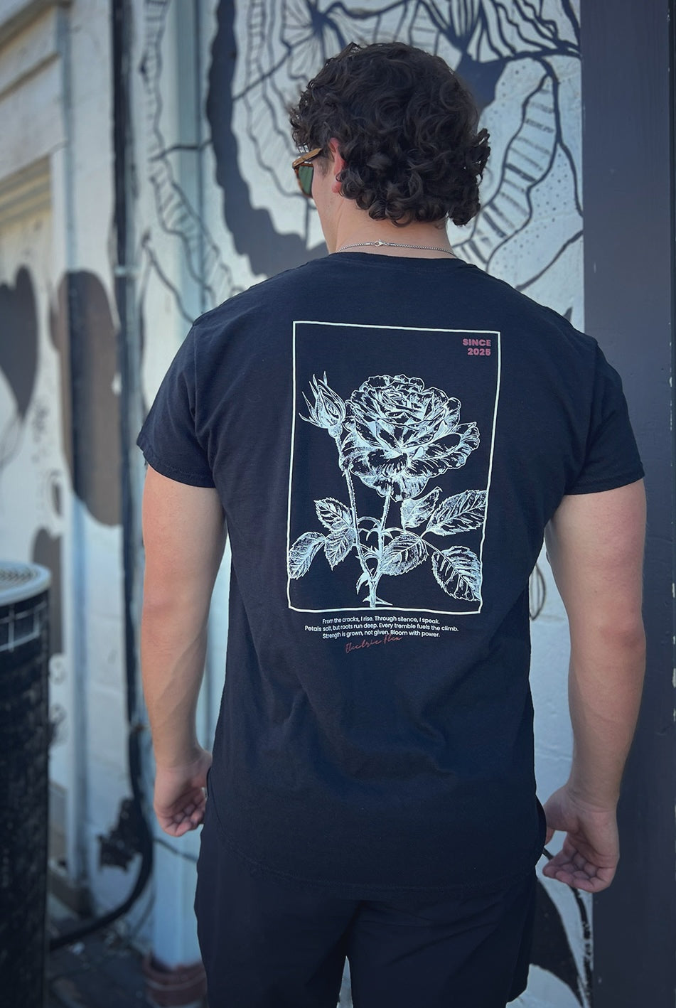 Crafted from 100% premium cotton, this premium black tee features a subtle yet striking rose design—a symbol of quiet resilience. On the back, a bold message: