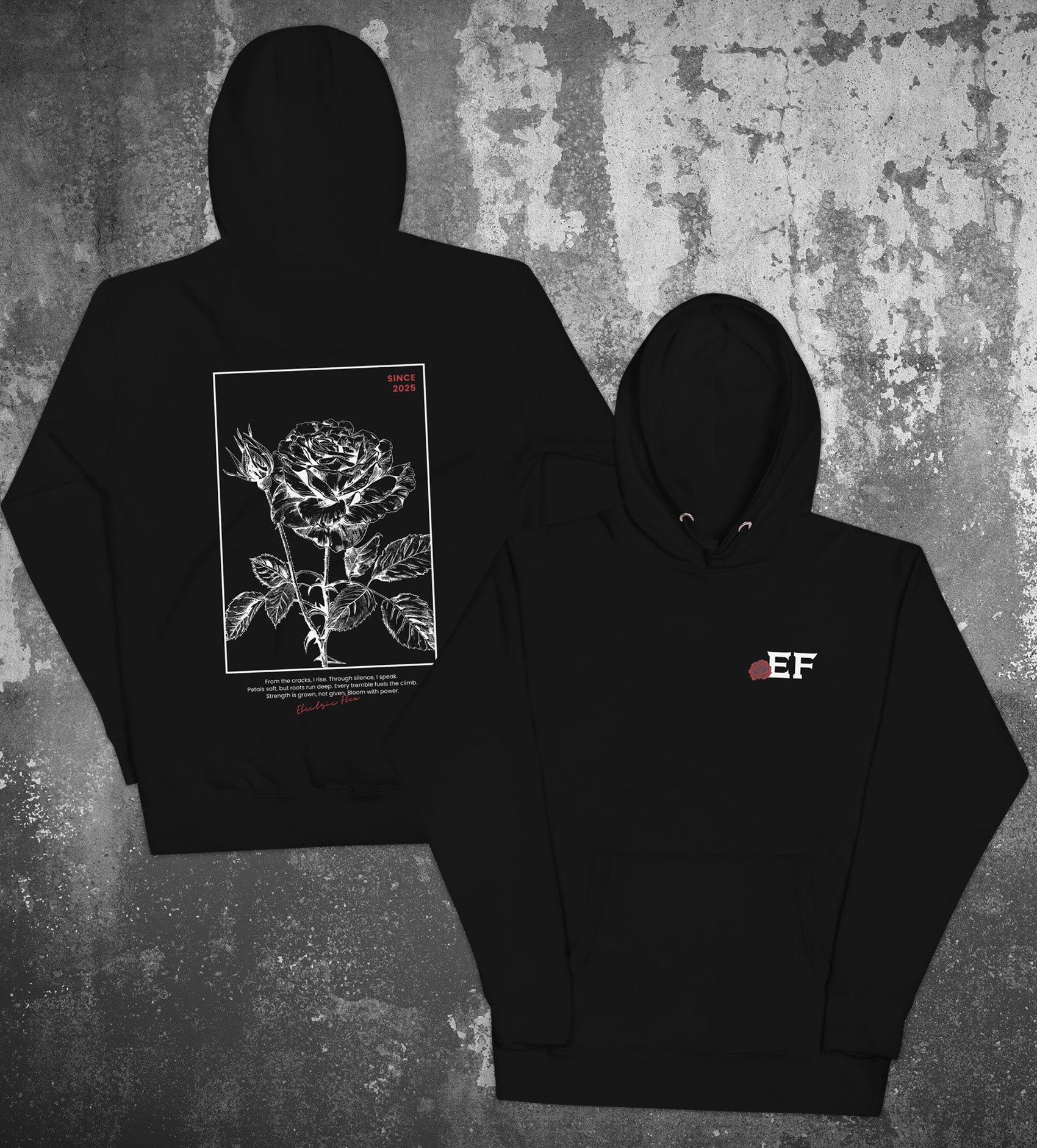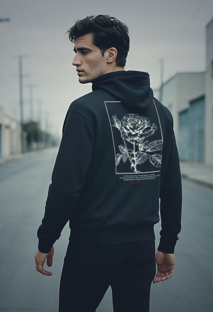 This black heavyweight hoodie wraps you in warmth and meaning. Featuring a white rose design on the front and a message on the back that hits like truth: