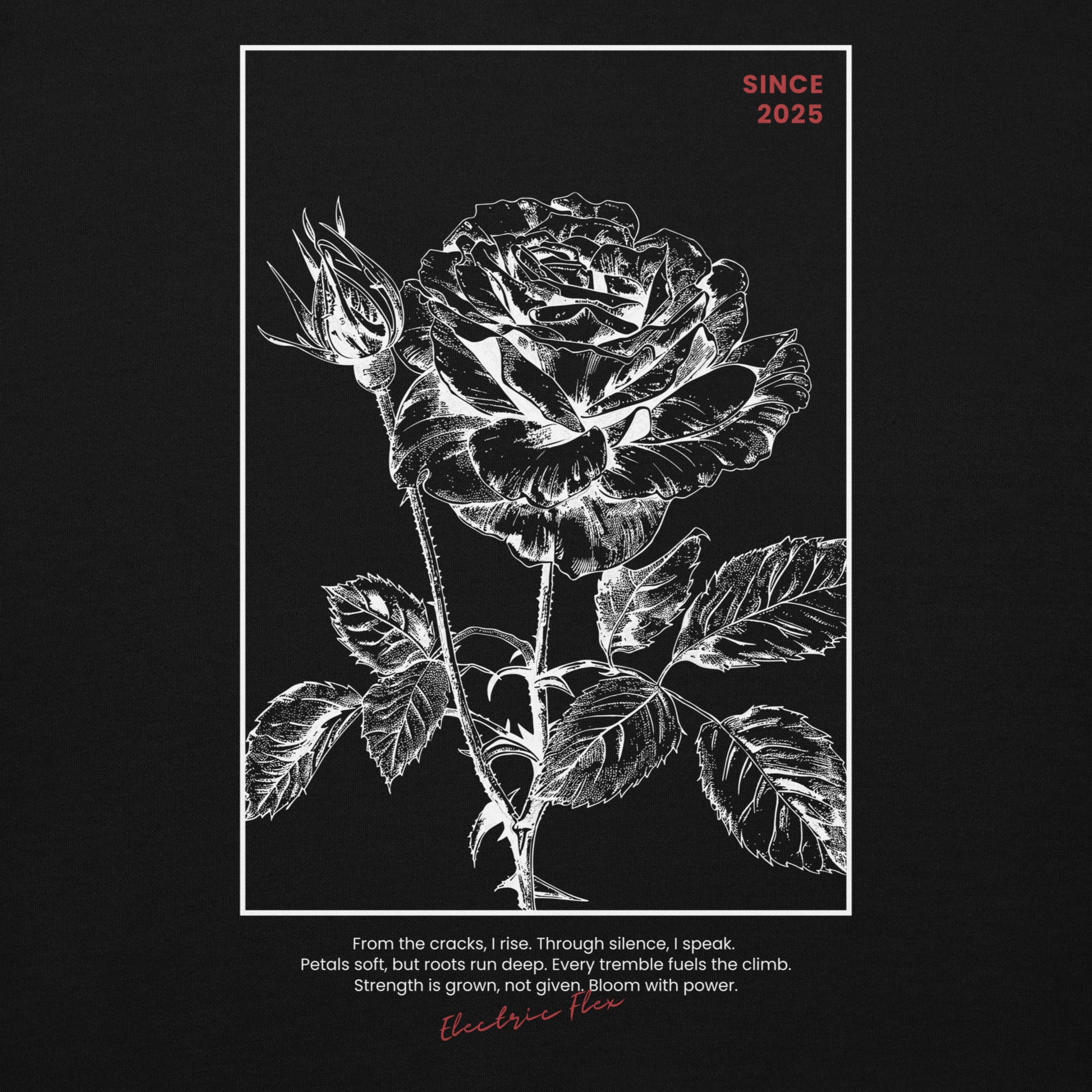 “From the cracks, I rise. Through silence, I speak. Petals soft, but roots run deep. Every tremble fuels the climb. Strength is grown, not given. Bloom with power.”