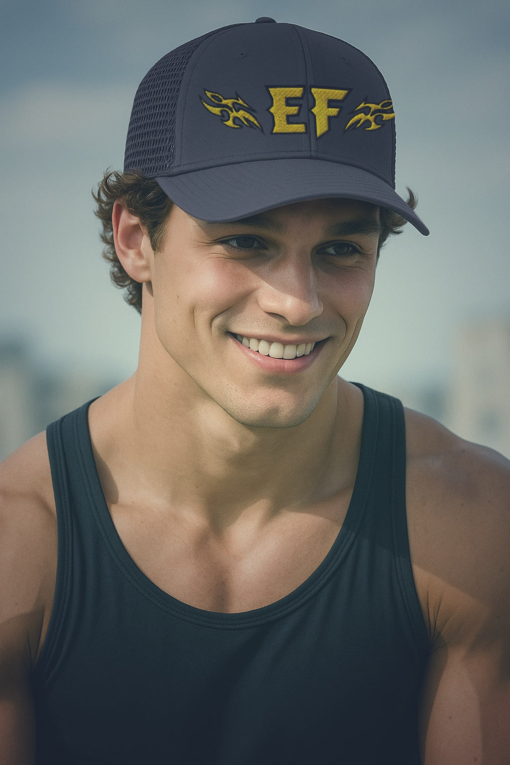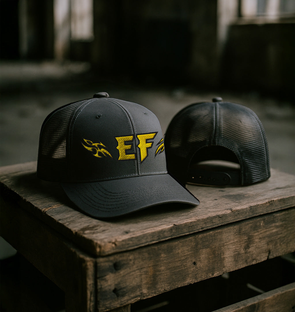 A classic reworked with edge. This six-panel trucker hat features a structured front, breathable mesh back, and a curved visor built for movement. The embroidered design on the front panel adds a bold, lasting finish—no fading, no flaking, just real texture. Whether you're lifting under the sun or just flexing in the wild, it’s your go-to for everyday shade with purpose.