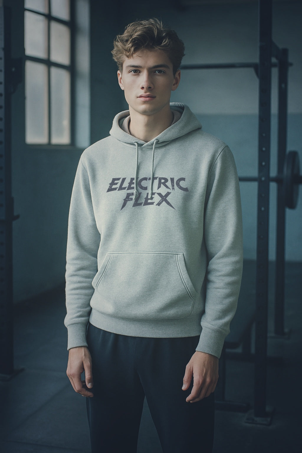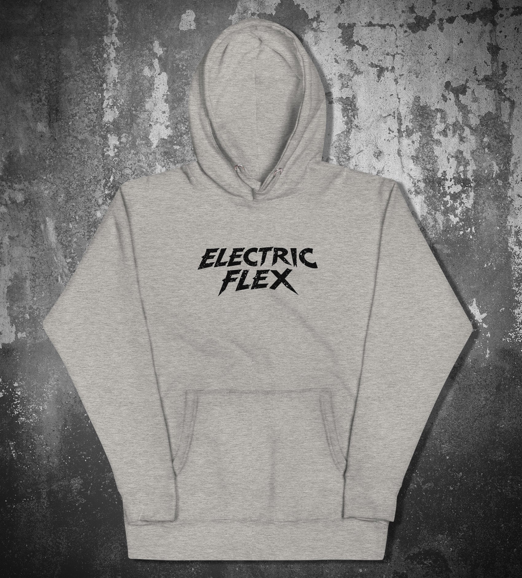 This gray hoodie features the signature Electric Flex logo in a bold grunge style printed front and center—no extras, no noise, just a raw statement of strength, energy, and edge.