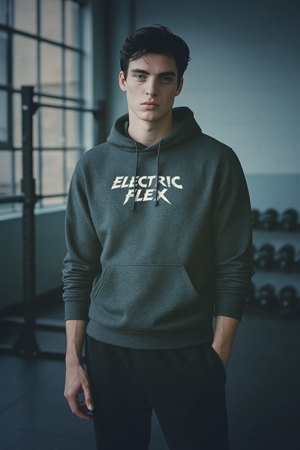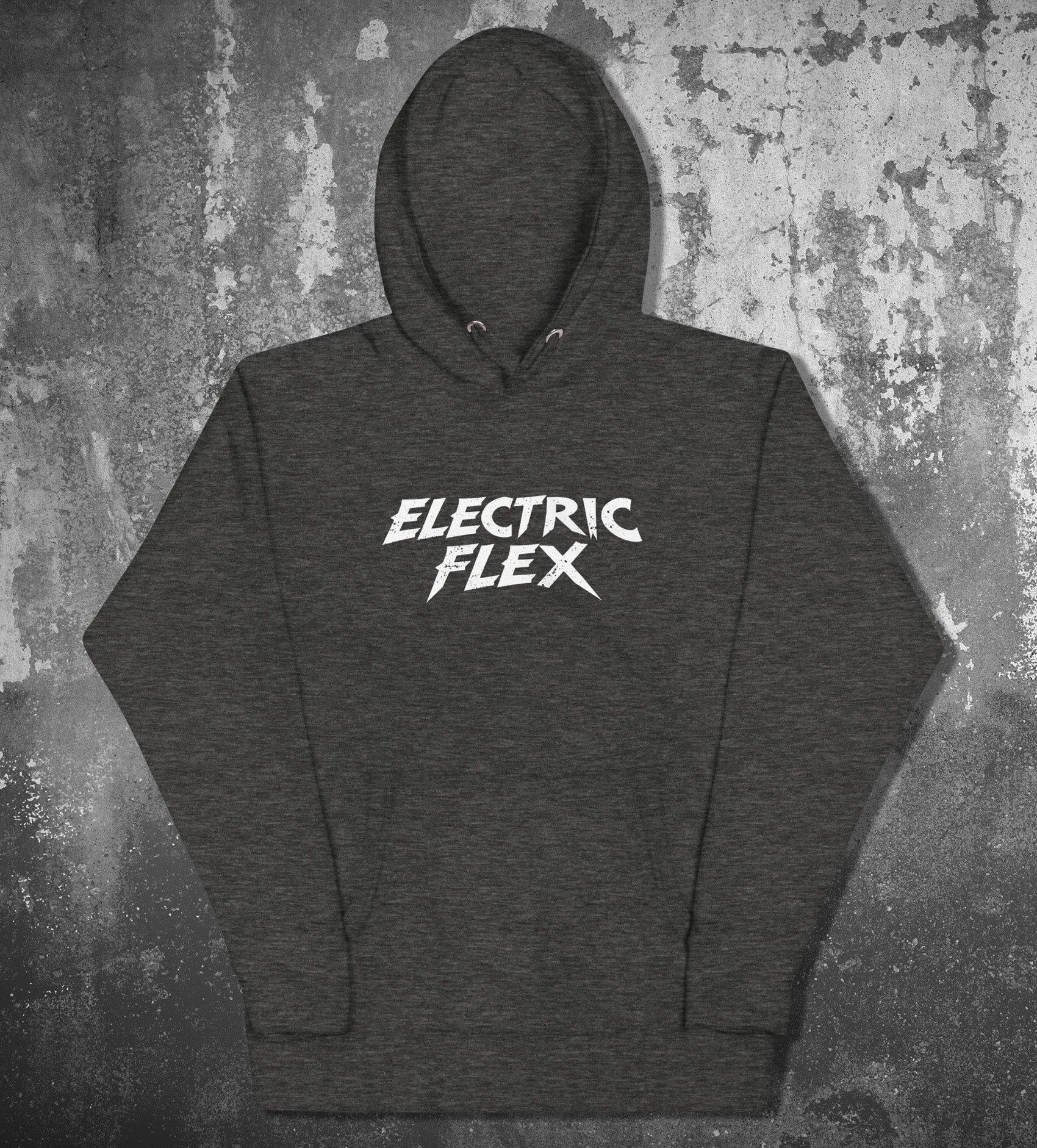 This hoodie features the Electric Flex logo in distressed white across the chest—a clean, grunge-inspired design that keeps things bold without saying a word.