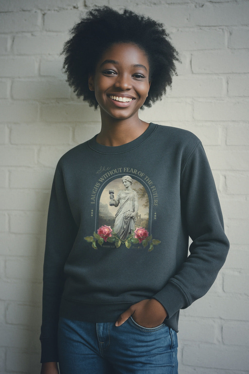 This cozy sweatshirt channels ancient strength with a modern soul. Featuring a statue lifting a barbell overhead—surrounded by soft pink roses and the words “She laughs without fear of the future – Proverbs 31:25”—it’s a tribute to courage, power, and unwavering grace.