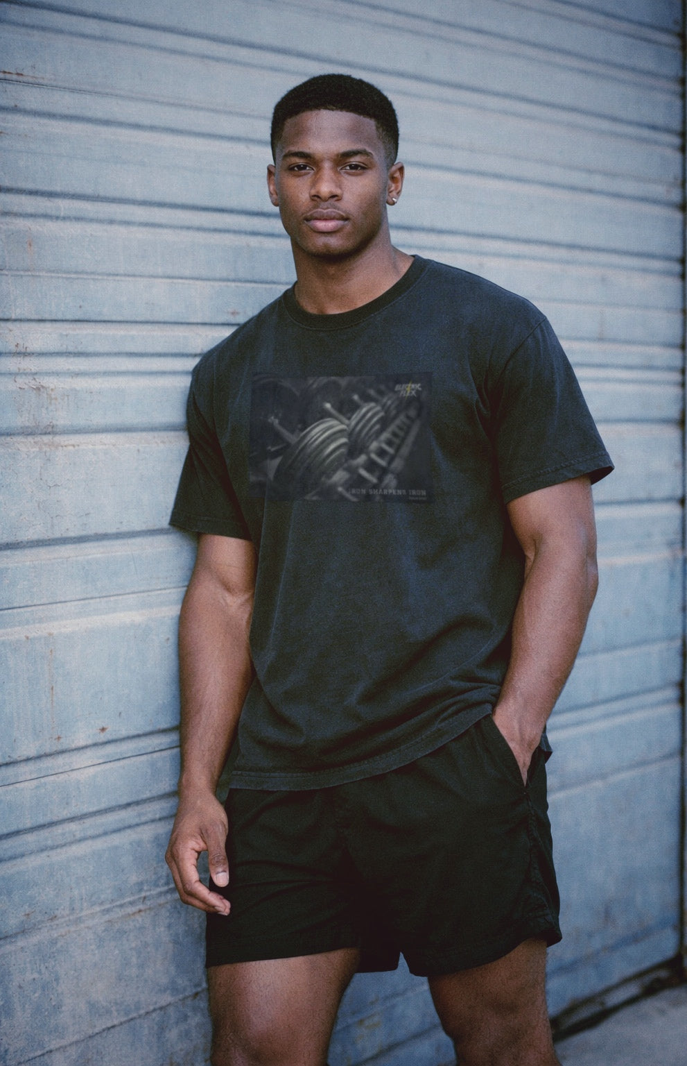 Featuring a grainy black-and-white photo of hand weights on the gym floor, this design speaks to the discipline, repetition, and quiet effort that build real strength. Below the image reads: “Iron Sharpens Iron – Psalm 27:17”—a reminder that growth happens through resistance, and we’re sharpened by what we face and who we train with.