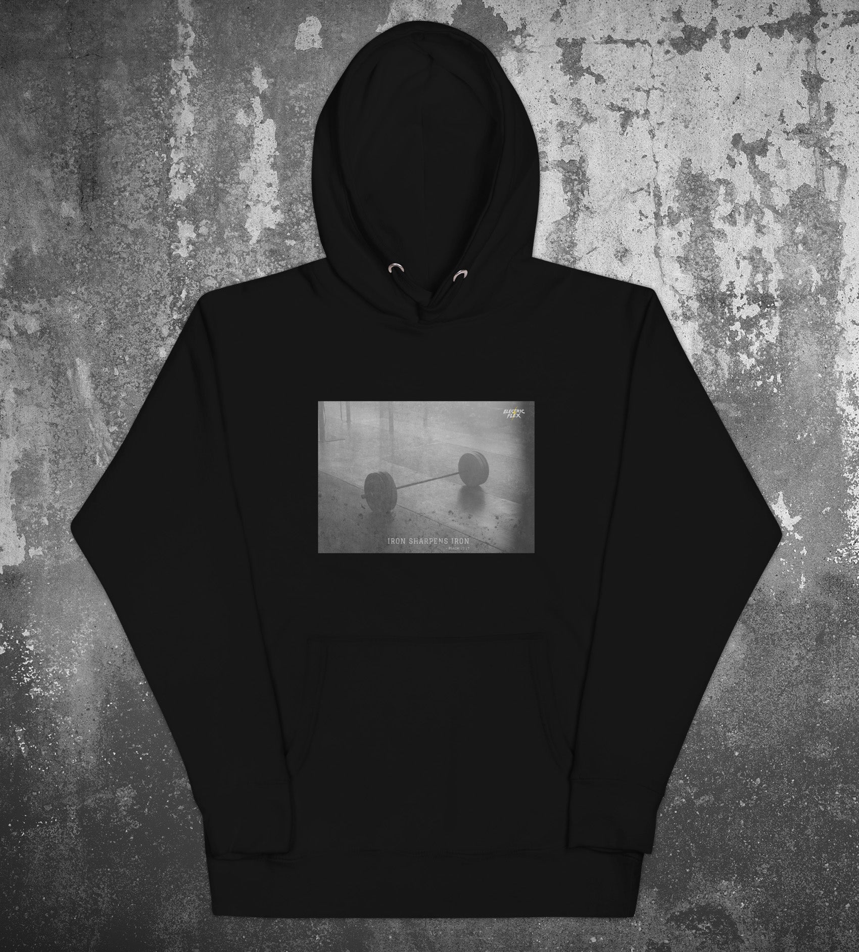 This isn’t just a hoodie—it’s a mindset. Featuring a grainy black-and-white photo of an empty gym and a lone barbell resting on the floor, this design speaks to the quiet grind that forges real strength. Below the image reads: “Iron Sharpens Iron – Psalm 27:17”—a bold reminder that we’re shaped by the effort, the resistance, and the willingness to show up when no one’s watching.