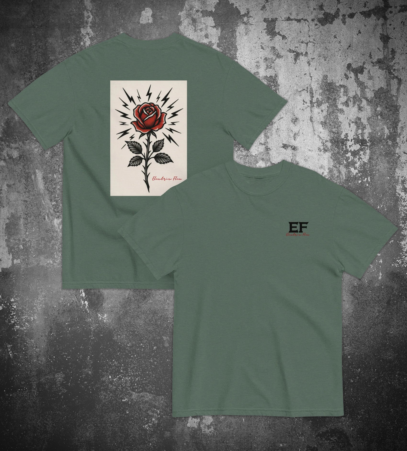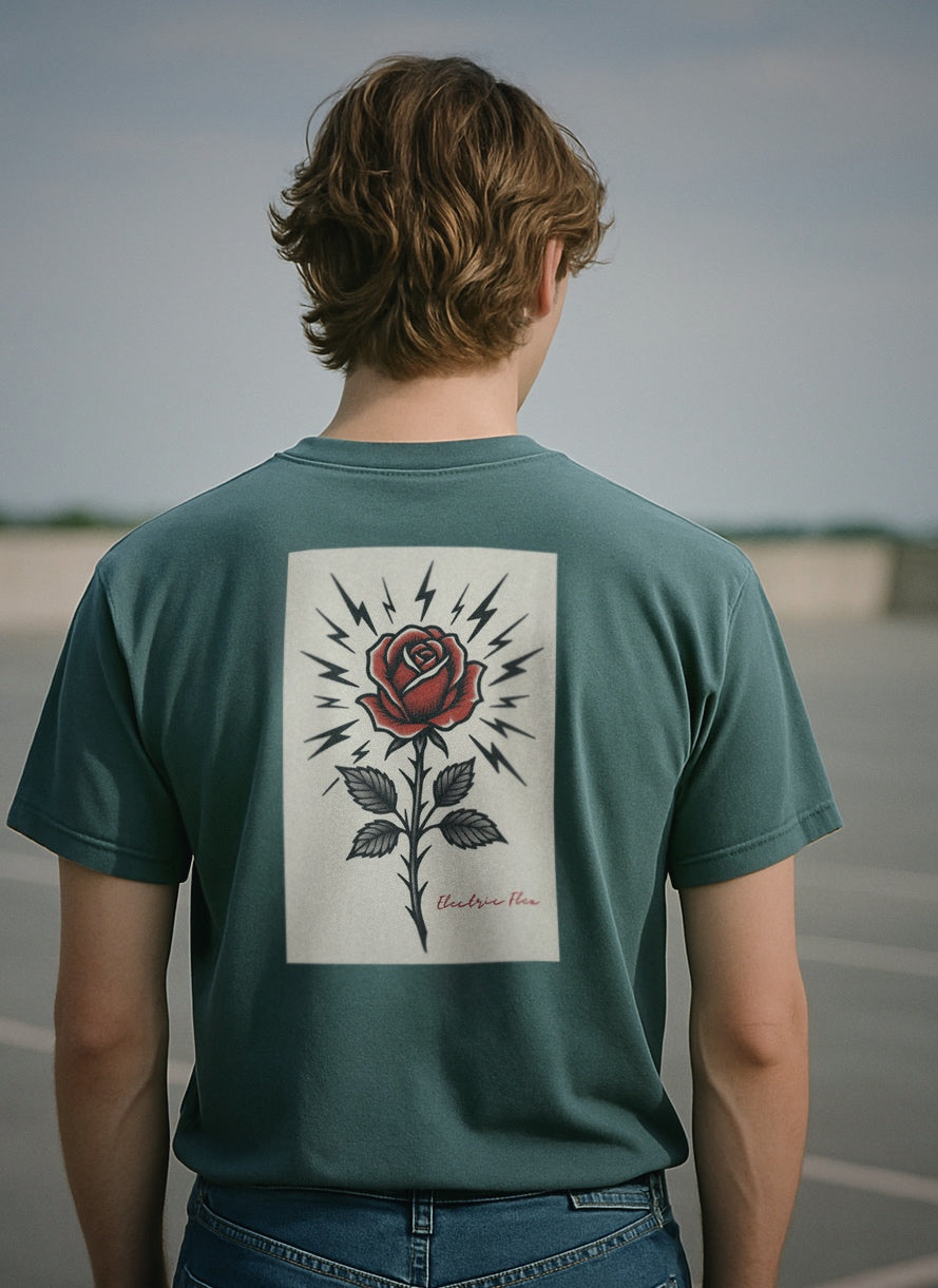 This Electric Flex tee features a clean logo hit on the front and a bold tattoo-inspired rose with lightning bolts on the back. It’s the perfect blend of structure and style, with heavyweight cotton that holds its shape and streetwear swagger that doesn’t try too hard.