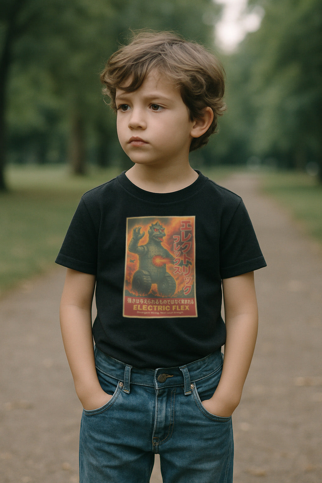 This 100% cotton shirt features a towering Robô Kaiju—part Godzilla, part mech warrior—charging through the city with Electric Flex energy. Bold Japanese lettering and the slogan "Divergent Wiring. Next Level Strength" celebrate the power that comes from thinking differently and pushing beyond limits.