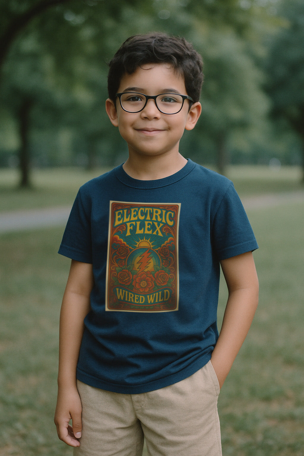 Let their wild side shine in this retro-inspired tee featuring a bold sun, lightning bolts, and groovy florals. With a vintage album cover vibe and the words Electric Flex, Wired Wild, this shirt is all about big energy and bright style. Made from soft, durable cotton and low-impact dyes, it’s comfy enough for everyday adventures—and cool enough for whatever they dream up next.